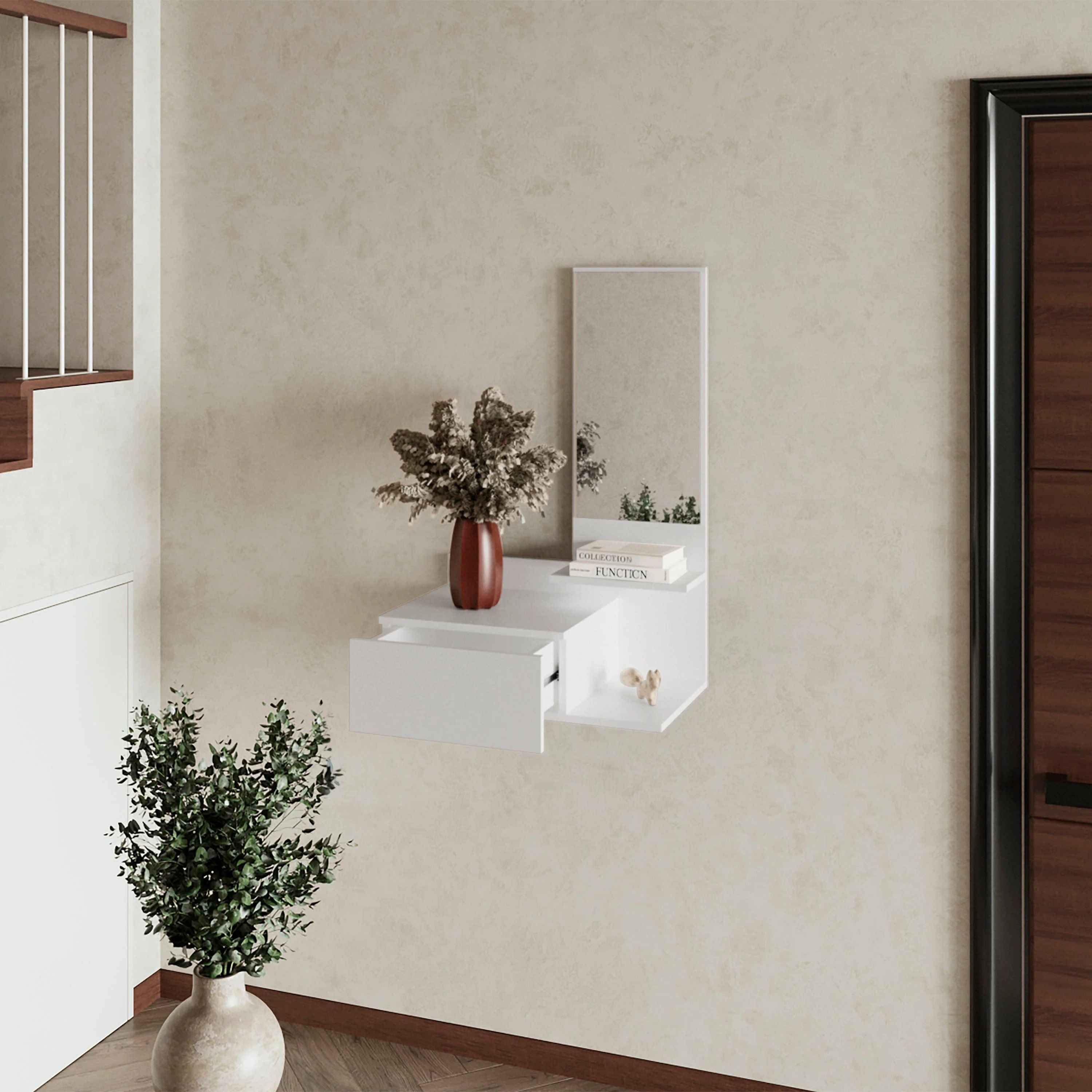 This wall-mounted shelf is designed to save floor space, making it ideal for small bathrooms, living rooms, or compact areas, and features an integrated mirror that allows for personal grooming without the need for additional accessories. With all necessary hardware included for quick and simple installation on any wall, the elegant white finish enhances its modern aesthetic, making it a versatile addition that seamlessly complements any decor style.