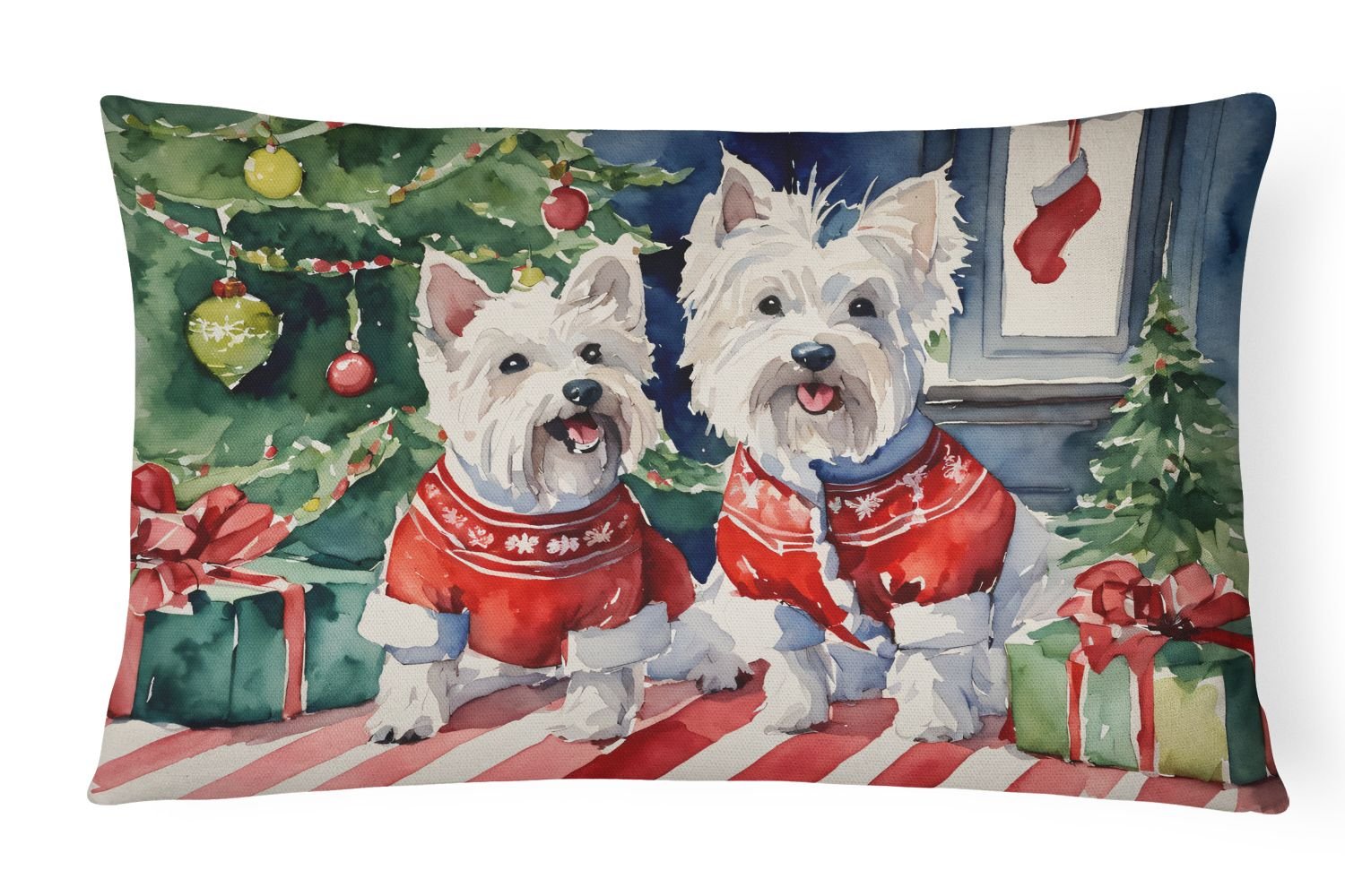 Throw Pillow featuring breed specific West Highland White Terrier artwork. Celebrate Christmas with this Christmas Pillow. Embrace the fusion of comfort and style with Caroline's Treasures Fabric Decorative Pillow. This 12x16 inch outdoor pillow is designed to complement your patio furniture, adding a splash of color and artistry to your outdoor setting. Constructed with a 100% Polyester Fabric pillow sham filled with a plush pillow form, this cushion is as comfortable as it is durable. Our outdoor pillow utilizes a novel fabric, meticulously woven for enhanced water resistance. This soft canvas material is equally suited for your indoor couch as well as outdoor settings such as the patio, porch, or veranda. To ensure enduring vibrance, we employ colorfast dyes resistant to fading even when subjected to weather elements. The making of this pillow involves the delicate sewing together of three fabric pieces to create a sham, into which a polyester insert is carefully placed. The result is an overstuffed pillow that tenaciously holds its shape. With both the sham and the pillow insert crafted in the United States, these handmade pillows are a testament to superior local craftsmanship. Note that as these pillows are handmade, sizes may slightly vary, enhancing their unique appeal. Enjoy comfort in style with Caroline's Treasures Fabric Decorative Pillow.