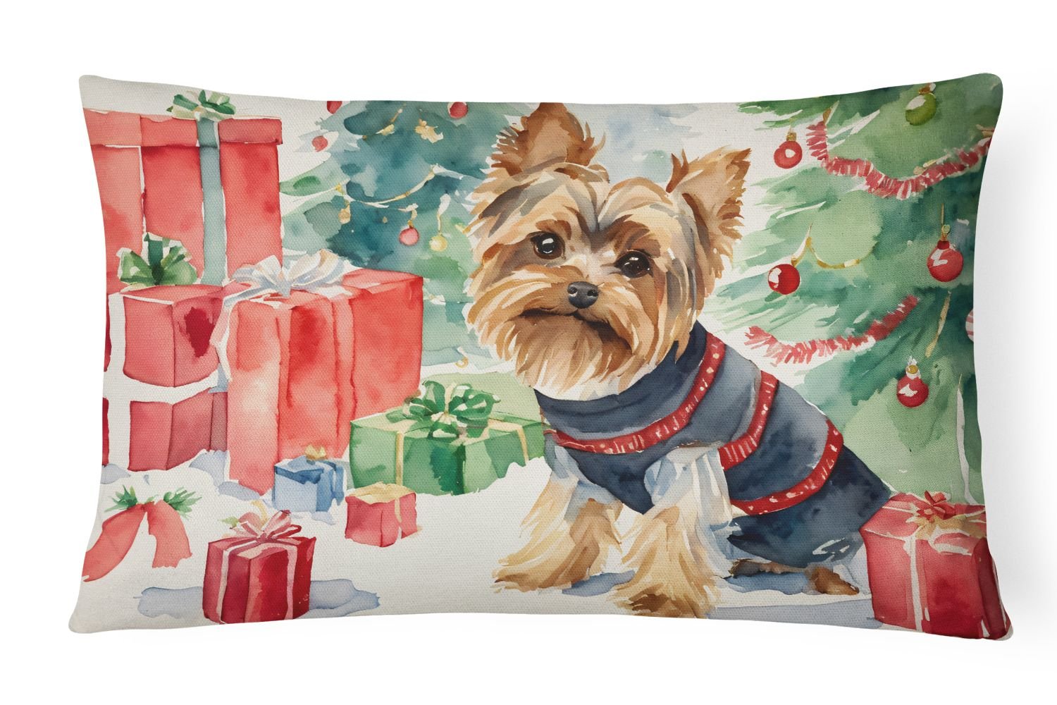 Throw Pillow featuring breed specific Yorkshire Terrier artwork. Celebrate Christmas with this Christmas Pillow. Embrace the fusion of comfort and style with Caroline's Treasures Fabric Decorative Pillow. This 12x16 inch outdoor pillow is designed to complement your patio furniture, adding a splash of color and artistry to your outdoor setting. Constructed with a 100% Polyester Fabric pillow sham filled with a plush pillow form, this cushion is as comfortable as it is durable. Our outdoor pillow utilizes a novel fabric, meticulously woven for enhanced water resistance. This soft canvas material is equally suited for your indoor couch as well as outdoor settings such as the patio, porch, or veranda. To ensure enduring vibrance, we employ colorfast dyes resistant to fading even when subjected to weather elements. The making of this pillow involves the delicate sewing together of three fabric pieces to create a sham, into which a polyester insert is carefully placed. The result is an overstuffed pillow that tenaciously holds its shape. With both the sham and the pillow insert crafted in the United States, these handmade pillows are a testament to superior local craftsmanship. Note that as these pillows are handmade, sizes may slightly vary, enhancing their unique appeal. Enjoy comfort in style with Caroline's Treasures Fabric Decorative Pillow.